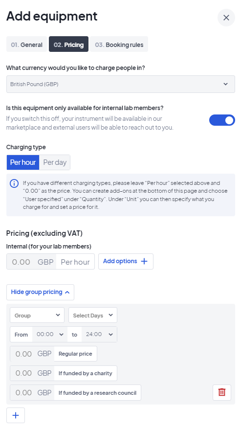 Yes. On the Pricing section of each equipment, there is an option to Add group pricing. You can set different prices for the different Groups you have created and also for 3 different types of Projects/Funding Codes in each Group (General price, Charity price and Research Council price) - see image for reference.