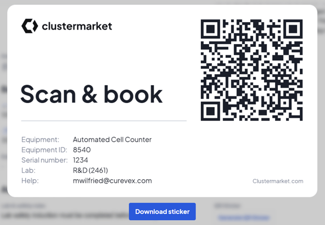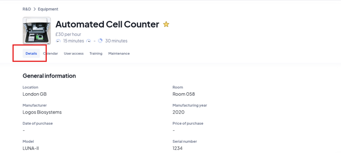 To create the QR code for your instrument, select the equipment and head to the equipment details page.