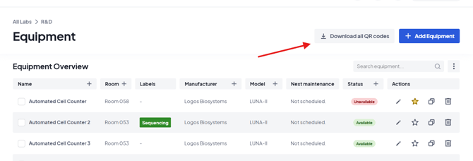 If you would like to download QR codes for all your instruments, you can do so on the Equipment Overview page at the top: