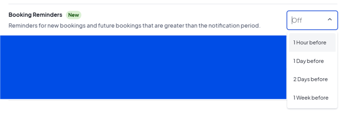 Reminders can be sent 1 hour, 1 day, 2 days, or 1 week before the booking starts.