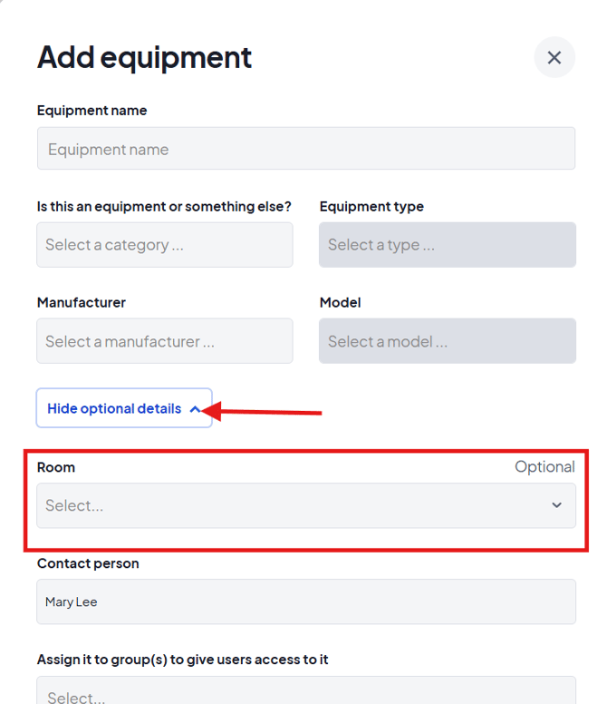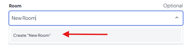 You can select to assign the equipment from any existing rooms in this list, or to create a new room, simply type the name of the room in the box. You will see a 'Create' button appear after you have typed the name. Click this, and the new room will be selected for you.