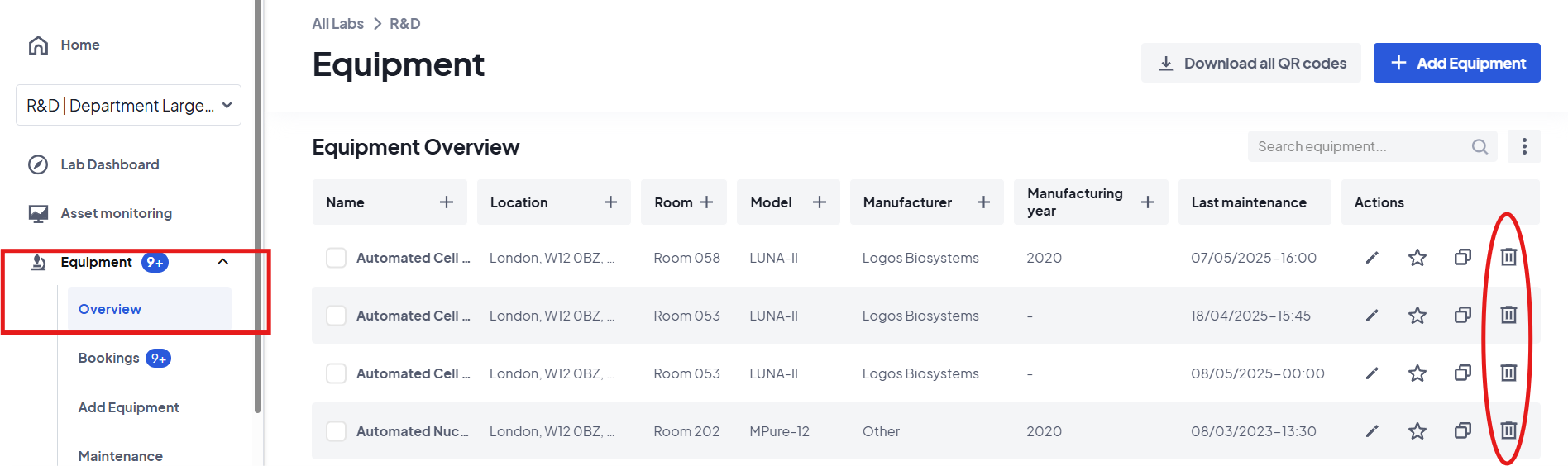 How do I delete equipment from Calira? To delete an equipment / remove it from your lab, head to the equipment overview page. Here, you simply need to find the equipment in the list, and then press the bin icon to delete the equipment.