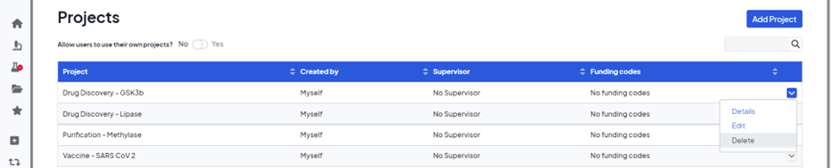 How do I delete Projects? To delete a Project, simply open the Projects page and click on the down pointing arrow on the right side of the Project you want to delete. You’ll see the Delete option right away.