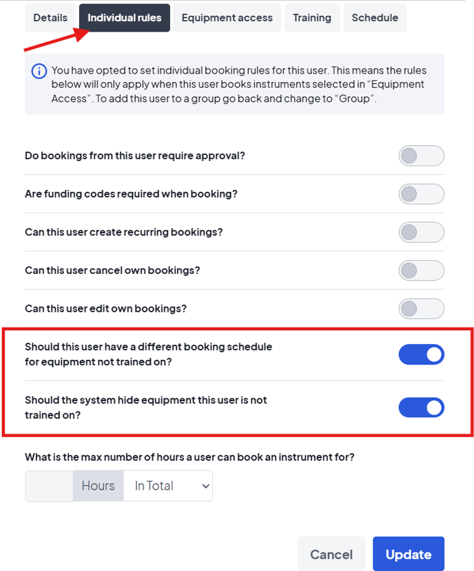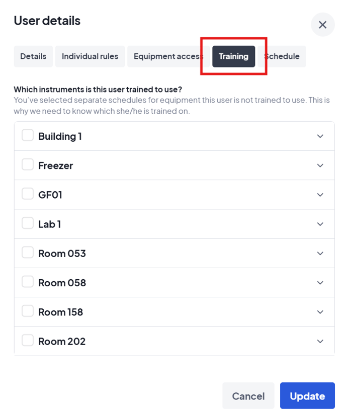 When this is turned on, you will notice some changes in the user settings. You will have a new tab called Training. Here, you can assign which equipment the user is trained on.