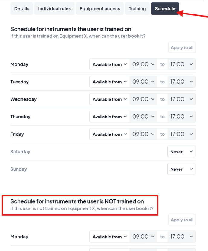 If you turn on the option that users should have a different booking schedule for equipment they are not trained on, you will find another scheduler on the Schedule tab. This is where you can set the access schedule for equipment that the user is and is not trained on: