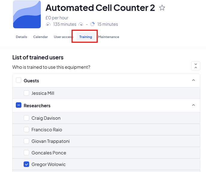 With the training feature turned on, you will also be able to see which of your users are trained on an equipment when you view the equipment details page on the Training tab: