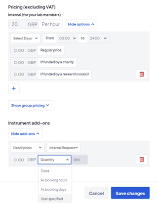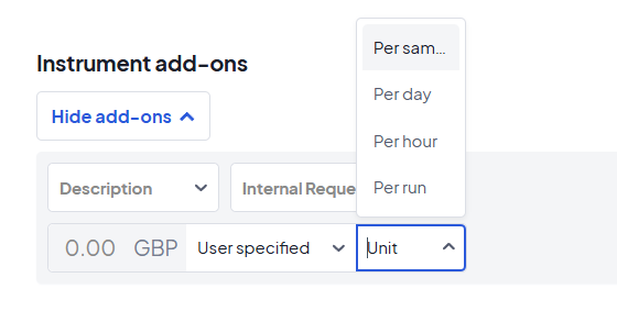 Set the price per sample, and then save the changes. Now when your user creates a booking, they can choose the add-on and input how many samples they require, and the price will be applied.